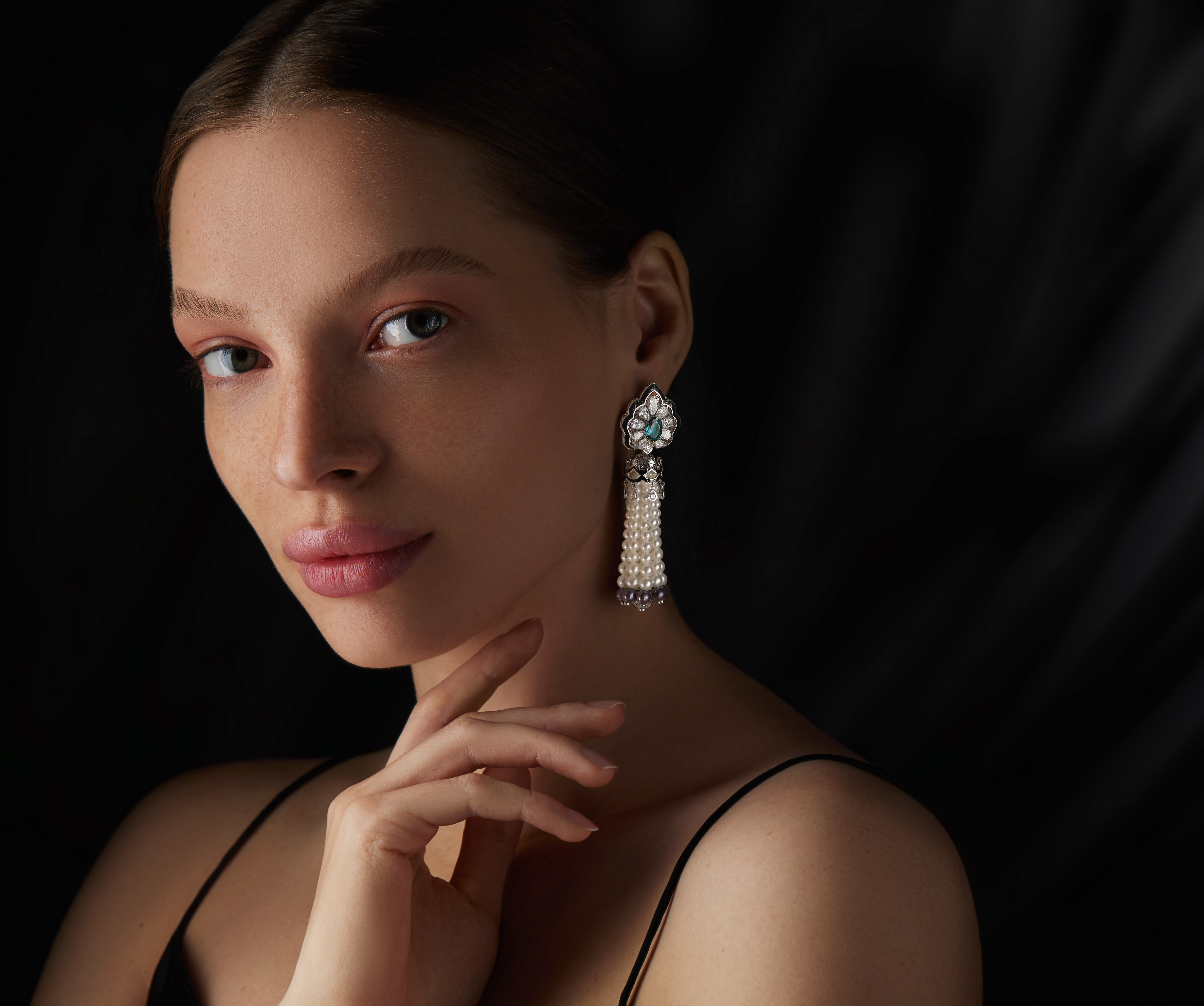 Парюра «Царевна-Лебедь» с аквамаринами, бриллиантами и жемчугом вдохновлена легендарным полотном Михаила Врубеля. Гармоничная палитра черного, серого и белого цветов дополнена захватывающим эффектом: центральные камни при дневном свете выглядят сине-зелеными, а при искусственном освещении — малиновыми с фиолетовыми тонами.