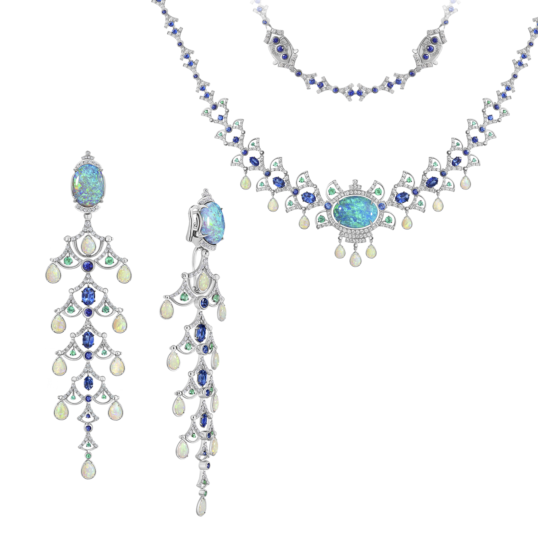 Мерцающие «капли» белых опалов и ритмичные переплетения природных сапфиров, изумрудов и бриллиантов в колье предвосхищают волшебное сияние и насыщенный цвет австралийского черного опала редкого бирюзового оттенка 18,78 ct.