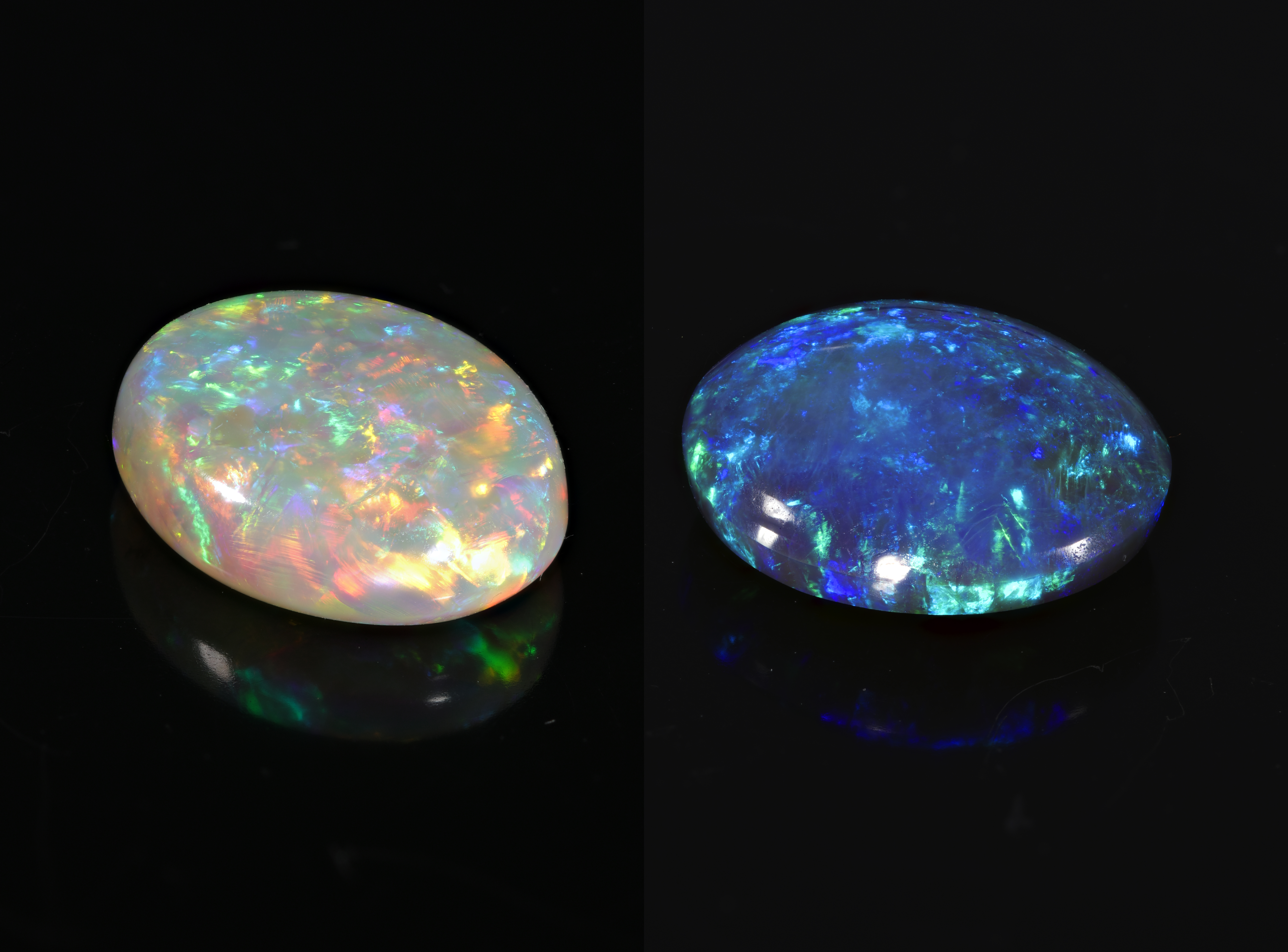 Основное отличие черного опала выражается в исключительной спектрально-чистой игре цветов. На поверхности черного опала чаще всего преобладают вспышки зеленого и синего цвета, но встречаются и совсем редкие камни – с примесью золотистого и красного цвета. В ювелирном деле высоко ценится черный опал бирюзового оттенка. Чем насыщеннее цвет камня, тем лучше в процессе его обработки раскрывается эффект опалесценции и мерцание.