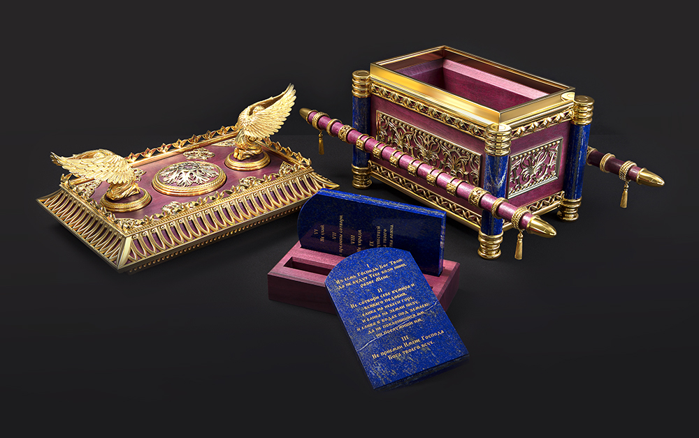 Широкий спектр примененных технологий позволил ювелирам воспроизвести детали Ковчега, подробно описанные в текстах Ветхого Завета. Чтобы сохранить идею сакральности, недоступной обывателю, был разработан специальный механизм открытия. Материалами для ювелирной миниатюры стали золото, серебро и дерево ценных пород — амарант. Отдельные детали акцентированы современным нанокерамическим покрытием. Скрижали с текстом десяти заповедей воссозданы из лазурита — камень небесного цвета помогает достичь смысловой целостности композиции.