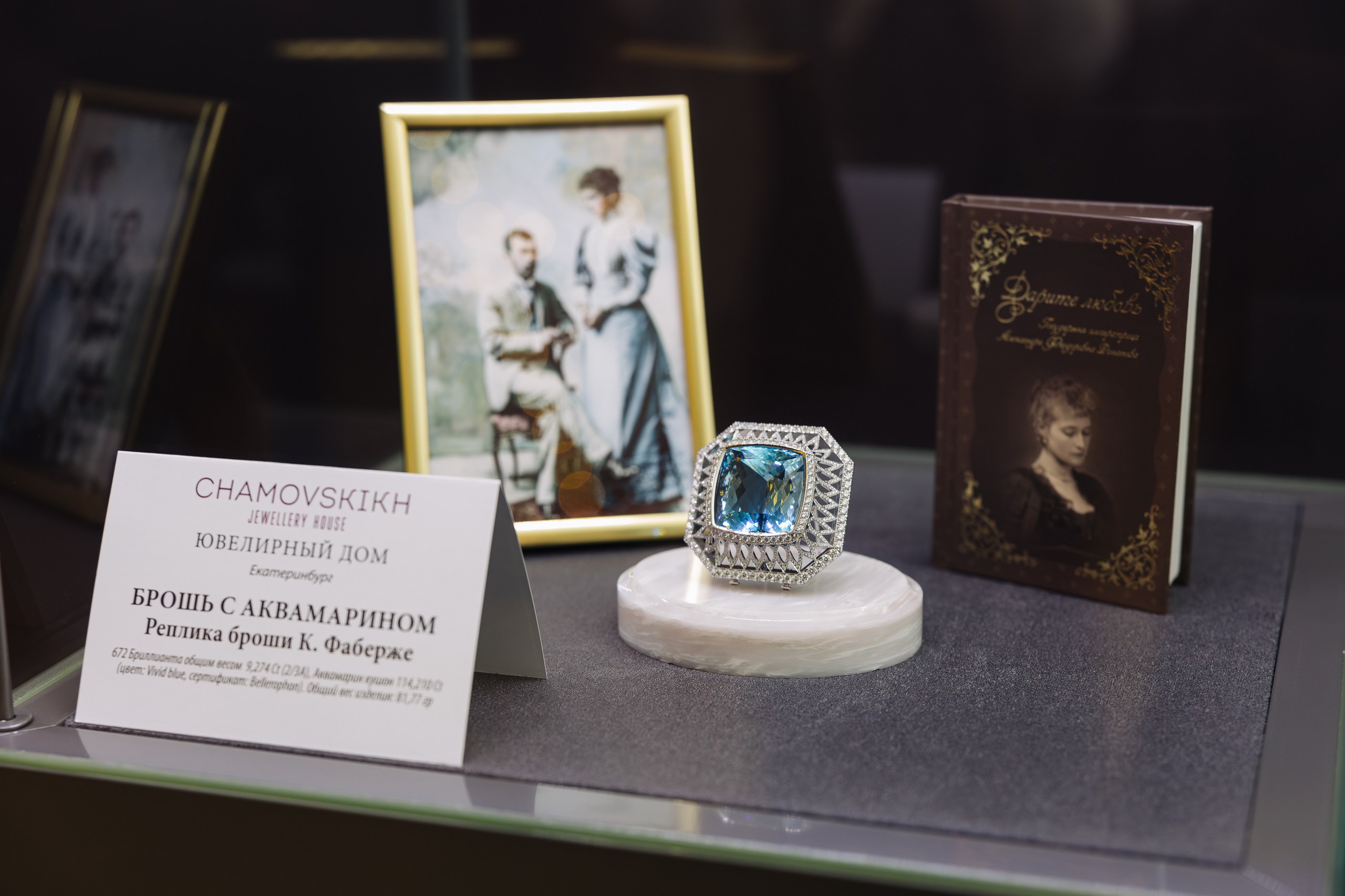Событие прошло в рамках выставки Гохрана России «Россия — любовь моя! Искусство ювелиров России. XIX – XXI век». Особое место в экспозиции заняла императорская брошь Карла Фаберже, воссозданная ювелирами CHAMOVSKIKH. Бриллиантовое украшение с 114-каратным аквамарином — современная интерпретация исторической драгоценности — свадебного подарка цесаревича Николая Александровича, будущего императора Николая Второго, его невесте — принцессе Алисе Гессен-Дармштадтской. Впервые бриллиантовую брошь представили осенью 2024 года на Московском финансовом форуме. В марте 2025 года уникальное украшение будет передано в Гохран России, чтобы занять достойное место в ряду подлинных шедевров, прославивших талант русских мастеров.