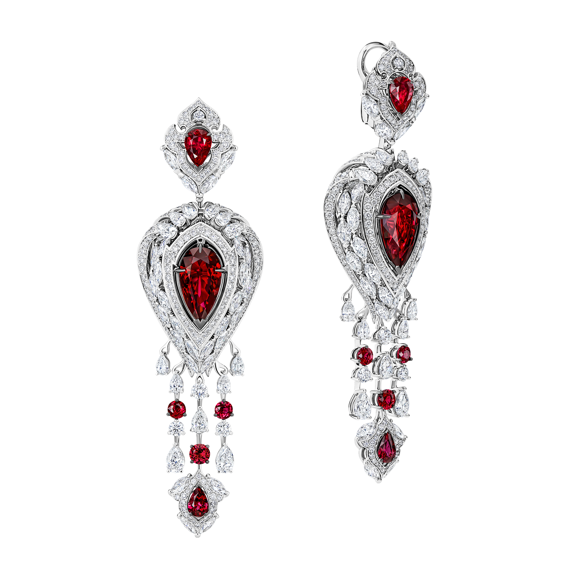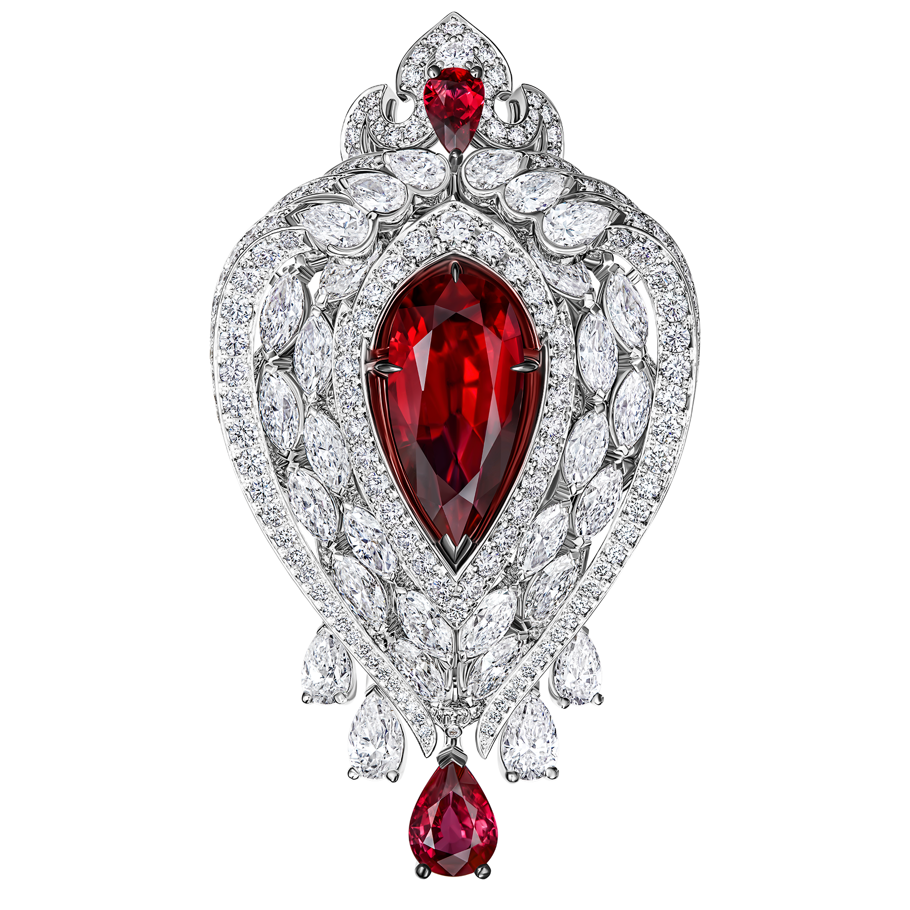В центре удлиненных серег сияют два великолепных рубина Pigeon’s Blood суммарным весом более 10,5 карат. Встретить подобный дуэт — редкая удача для коллекционеров. Дополняют парные «груши» 732 бриллианта общим весом более 16 карат и 12 рубинов премиальных характеристик.